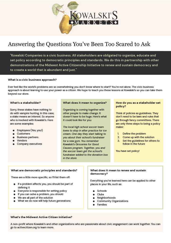 With this information gathered, I proceeded with crafting an internal newsletter. I wanted to highlight the ways that Kowalski’s appealed to their values with the company’s civic business approach. However, the civic mission is written in complex language that could be alienating. I opted to break it down in a fun and digestible way. I wanted to keep the separate sections short and clear, employing as many short lists in place of paragraphs as possible, in order to engage a worker who might only be glancing at this briefly before deciding if they’ll read it or not.