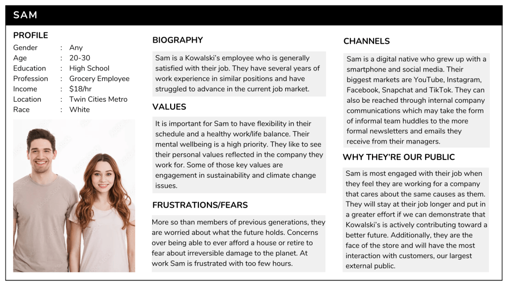 For this assignment, I was tasked with creating communications for a Kowalski’s target audience. I decided to focus on the workers within their stores. Through real data that I gathered through the US Census, The Pew Research Center, Glassdoor, my class textbook, and several online forums, I was able to create the following persona: